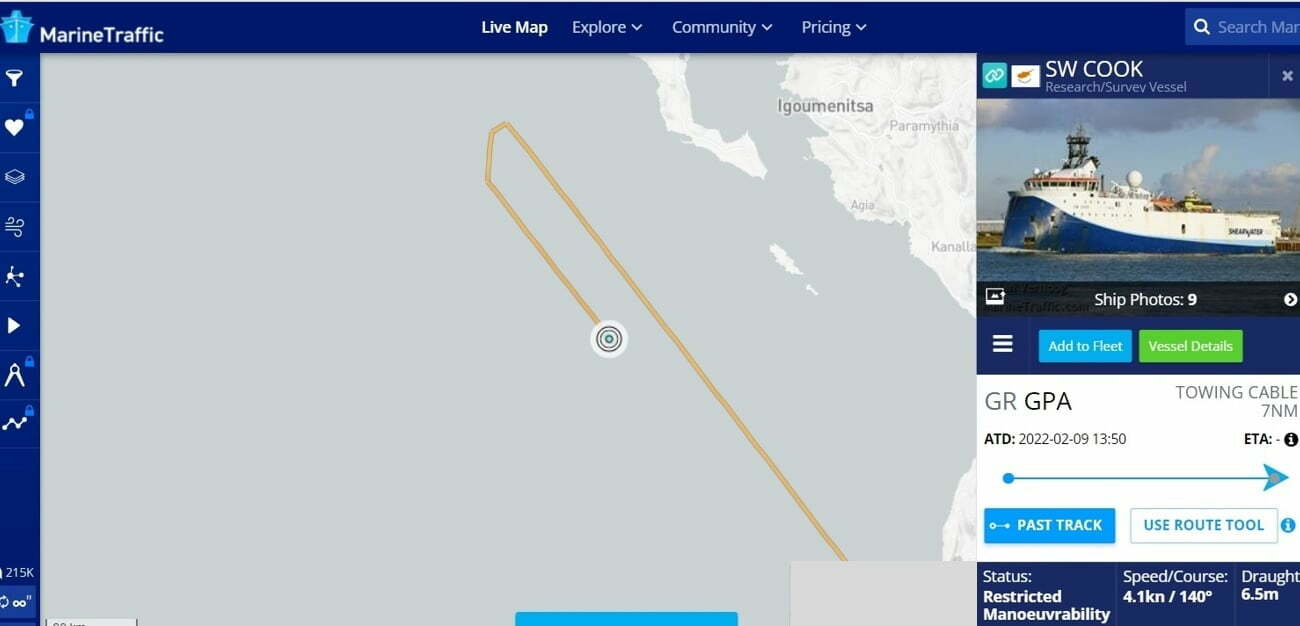 Ο εκβρασμός των Ζιφιών συμπίπτει χρονικά με την παρουσία, στην ίδια θαλάσσια περιοχή, του σεισμογραφικού πλοίου SW Cook, με σημαία Κύπρου, το οποίο δραστηριοποιείται στην περιοχή από τις αρχές Φεβρουαρίου. Την ημέρα του εκβρασμού ακολουθούσε βόρεια πορεία από Κεφαλονιά προς Κέρκυρα και έπειτα έκανε αναστροφή 180 μοιρών στο μέσο περίπου της Κέρκυρας, κοντά στην περιοχή όπου έγιναν οι εκβρασμοί. Καθ΄ ολη αυτή την πορεία έως και σήμερα – μία ημέρα μετά – διατηρεί σταθερή ταχύτητα 4 μιλίων, άρα συνεχίζει αδιάλειπτα τις ισχυρές ηχητικές εκρήξεις. Την ίδια χρονική στιγμή, ένα δεύτερο σεισμογραφικό πλοίο, το νορβηγικό Geo Barents, επίσης διέπλεε τα διεθνή ύδατα ανοιχτά της Κέρκυρας, με πορεία από τις ακτές της Αλβανίας προς τη νότιο Ιταλία, όμως δεν είναι ακόμα γνωστό εάν και σε ποιές περιοχές έκανε χρήση του σεισμογραφικού εξοπλισμού του.