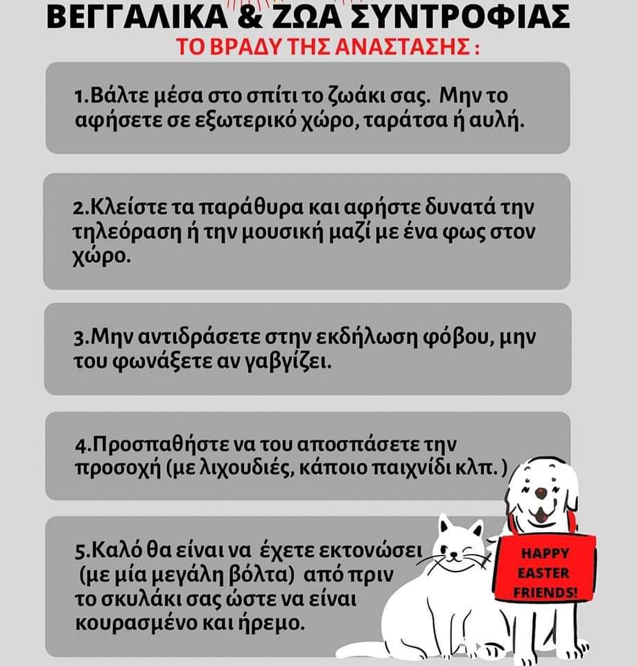 Η περίοδος του Πάσχα με αποκορύφωμα το βράδυ του Μεγάλου Σαββάτου είναι η πιο επικίνδυνη περίοδος στην Ελλάδα για τους μικρούς μας φίλους. Το φιλοζωικό Σωματείο Σάμου με ανακοίνωση του, καλεί τις αρχές για την εφαρμογή του νόμου που απαγορεύει την καύση κροτίδων, πυροτεχνημάτων, βεγγαλικών και εκρηκτικών καθώς αυτά μπορεί να είναι πραγματικός εφιάλτης για τα κατοικίδια ζώα, αδέσποτα , μικρά παιδιά και όχι μόνο.