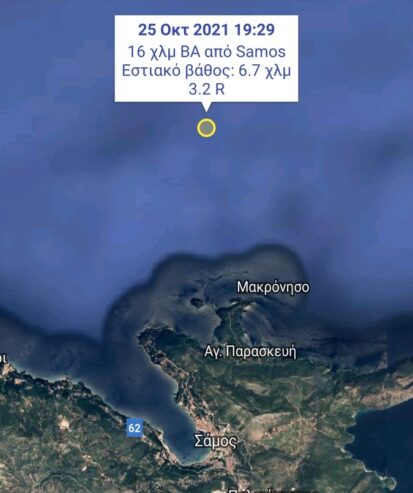 Η δόνηση σημειώθηκε στις 19:29 το βράδυ της Δευτέρας και το επίκεντρό της εντοπίστηκε σε απόσταση 16 χιλιομέτρων βορειοανατολικά της Σάμου, με εστιακό βάθος τα 6,7 χιλιόμετρα.