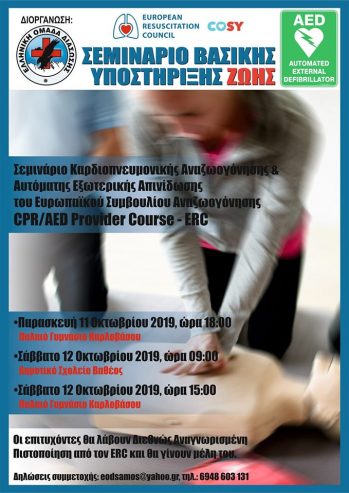 Το σαμιακό παράρτημα της Ελληνικής Ομάδας Διάσωσης διοργανώνει σεμινάρια Βασικής Υποστήριξης Ζωής (Καρδιοπνευμονικής Αναζωογόνησης και Αυτόματης Εξωτερικής Απινίδωσης του Ευρωπαϊκού Συμβουλίου Αναζωογόνησης CPR/AED Provider Course – ERC) σε Βαθύ και Καρλόβασι στις 11 και 12 Οκτωβρίου. Την Παρασκευή, 11 Οκτωβρίου, στις 18:00 στο Παλαιό Γυμνάσιο Καρλοβάσου, το Σάββατο, 12 Οκτωβρίου, στις 09:00 στο Δημοτικό Σχολείο Βαθέος και την ίδια ημέρα στις 15:00 στο Παλαιό Γυμνάσιο Καρλοβάσου. Οι επιτυχόντες θα λάβουν διεθνώς αναγνωρισμένη πιστοποίηση από τον ΕΡΨ και θα γίνουν μέλη του. Δηλώσεις συμμετοχής: eodsamos@yahoo.gr, τηλ.: 6948.603131.