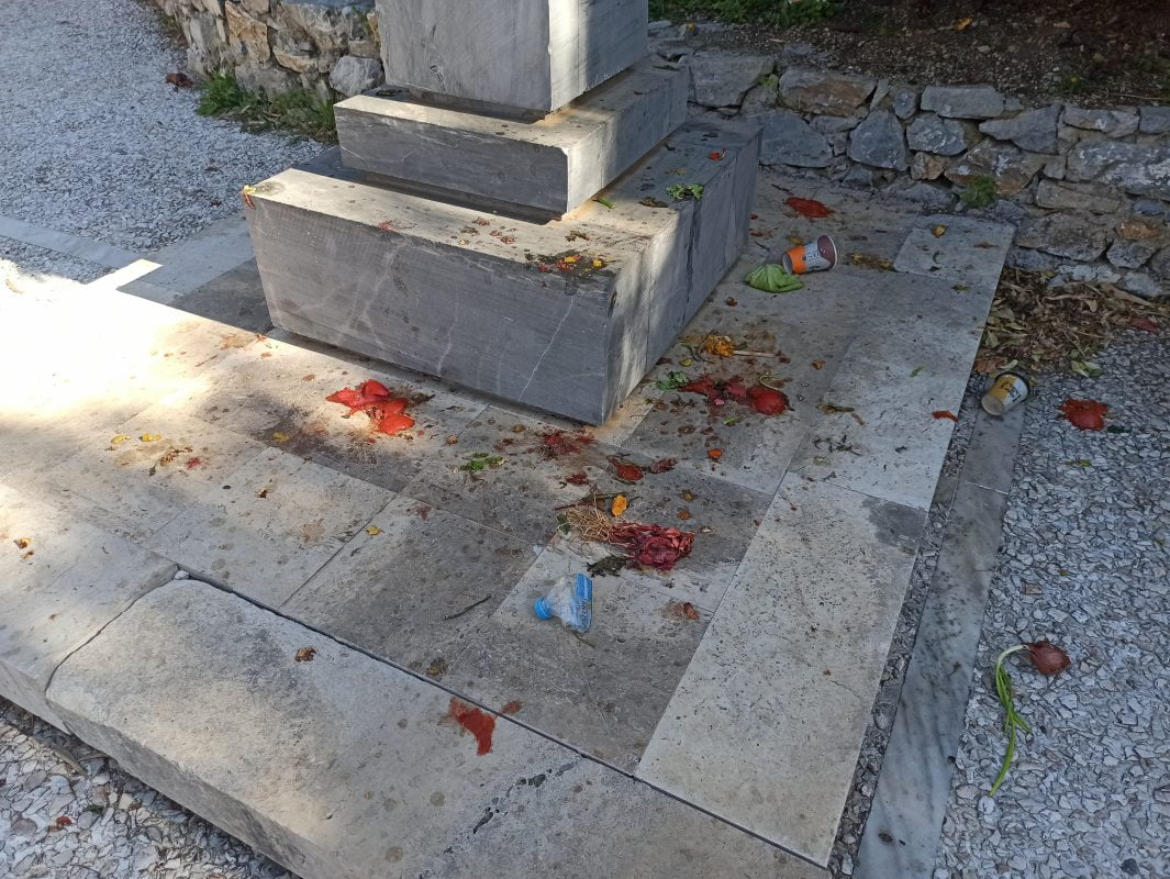 Άγνωστος ή άγνωστοι έριξαν στη μπροστινή όψη του μνημείου,ντομάτες και στη συνέχεια εξαφανίστηκαν.