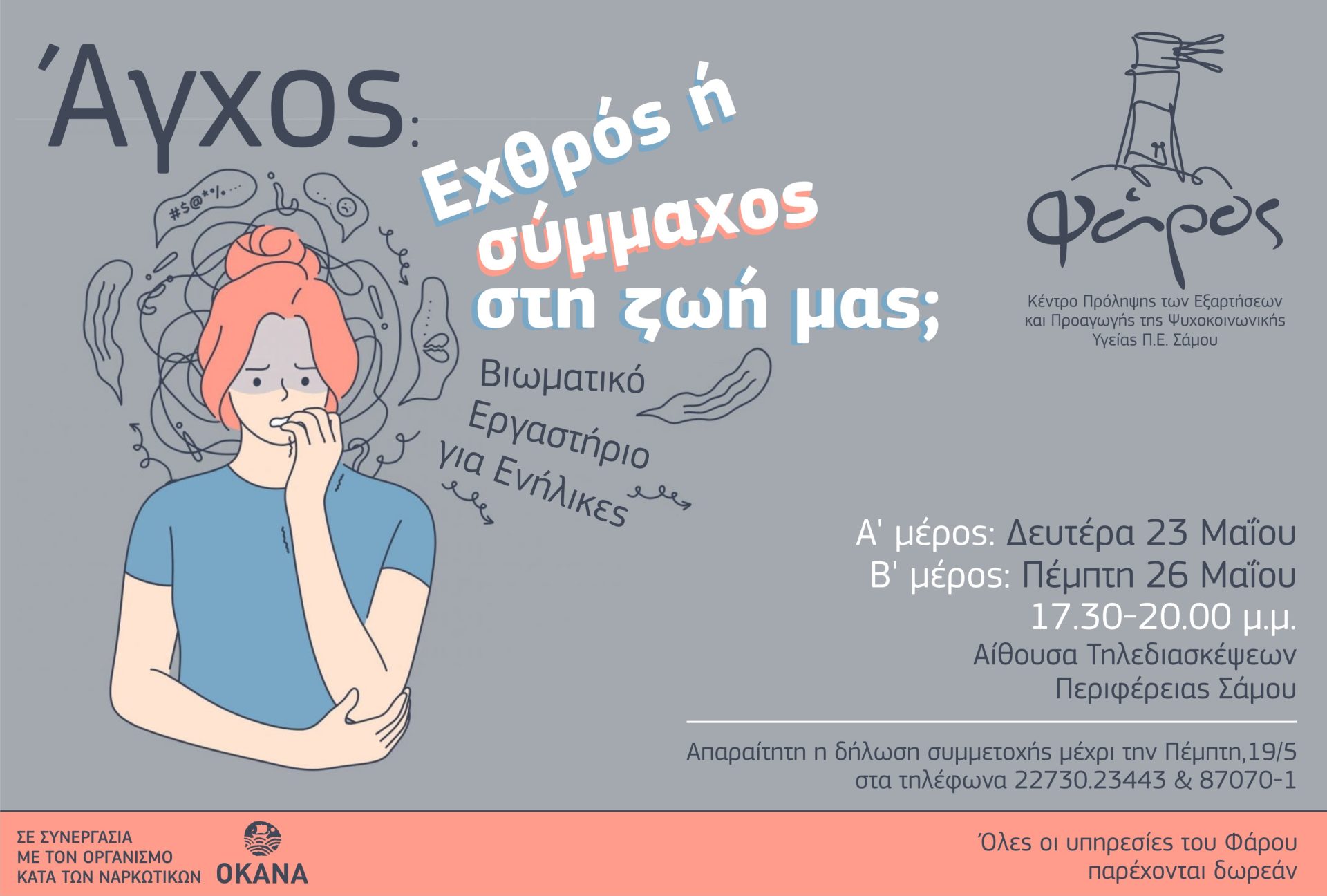 Το Κέντρο Πρόληψης Π.Ε. Σάμου “Φάρος” διοργανώνει διήμερο βιωματικό εργαστήριο -δια ζώσης- για ενήλικες με τίτλο «Άγχος: Εχθρός ή σύμμαχος στη ζωή μας;».