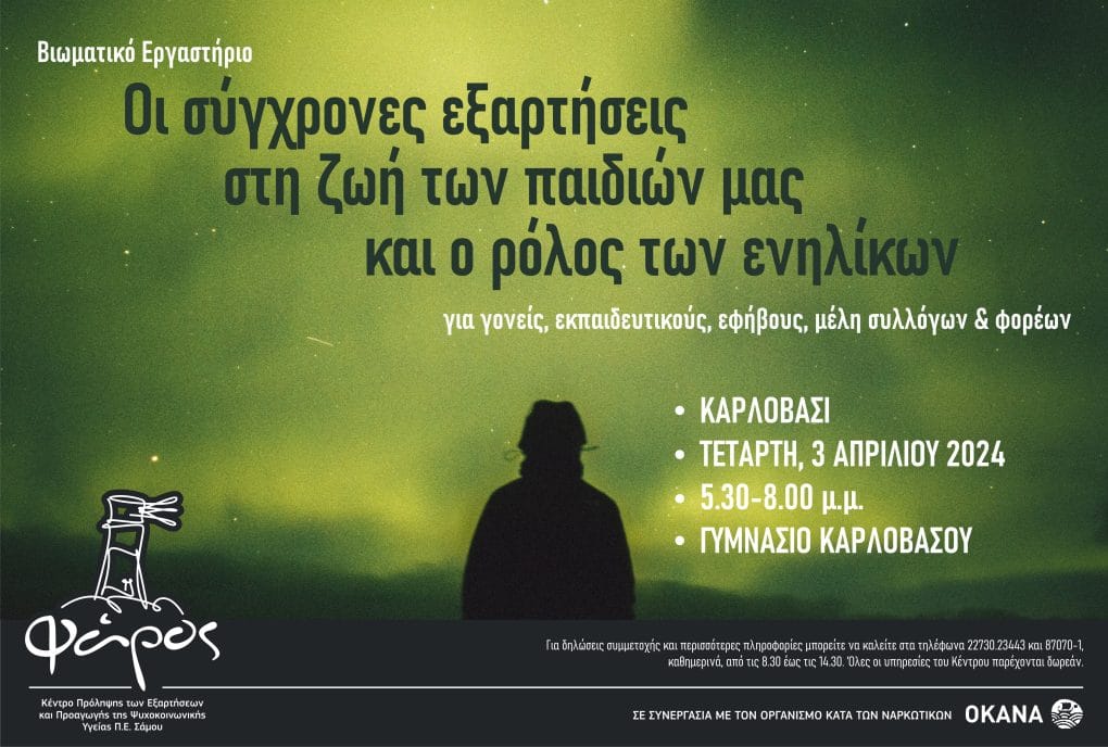 Tο Κέντρο Πρόληψης των Εξαρτήσεων & Προαγωγής της Ψυχοκοινωνικής Υγείας  Π.Ε Σάμου “Φάρος” πρόκειται να υλοποιήσει στο Καρλόβασι βιωματικό εργαστήριο με θέμα : «Οι σύγχρονες εξαρτήσεις στη ζωή των παιδιών μας και ο ρόλος των ενηλίκων». Στη συνάντηση μπορούν να συμμετέχουν γονείς, εκπαιδευτικοί και, γενικότερα, μέλη της κοινότητας που, είτε από τον επαγγελματικό τους ρόλο είτε εθελοντικά, σχετίζονται με τα παιδιά και τους εφήβους. Η συνάντηση θα πραγματοποιηθεί την Τετάρτη, 3 Απριλίου, σε αίθουσα του Γυμνασίου Καρλοβάσου από τις 5.30 έως 8.00 μ.μ.