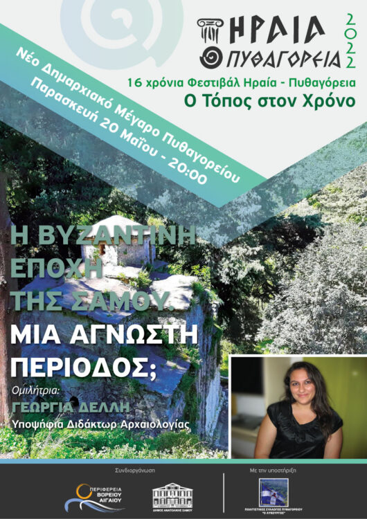 Την Παρασκευή, 20 Μαΐου στις 20.00, στο Νέο Δημαρχιακό Μέγαρο Πυθαγορείου, θα μιλήσει η υποψήφια Διδάκτωρ Βυζαντινής Αρχαιολογίας, κ. Γεωργία Δελλή με θέμα: