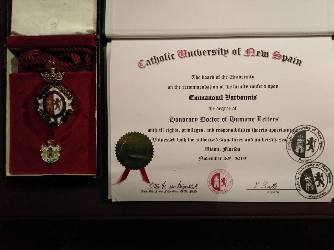 Στις 30 Νοεμβρίου 2019 το Ακαδημαϊκό Συμβούλιο (Academic Board) του Catholic University of New Spain, που εδρεύει στο Μαϊάμι της Φλώριντα, των ΗΠΑ, απένειμε στον συμπατριώτη μας Καθηγητή Λαογραφίας και Πρόεδρο του Τμήματος Ιστορίας και Εθνολογίας του Δημοκριτείου Πανεπιστημίου Θράκης κ. Μανόλη Γερ. Βαρβούνη την κορυφαία ακαδημαϊκή διάκριση του Επίτιμου Διδάκτορα (Honorary Doctor of Humane Letters), συνοδευόμενη από το χρυσό μετάλλιο του ιδρύματος.