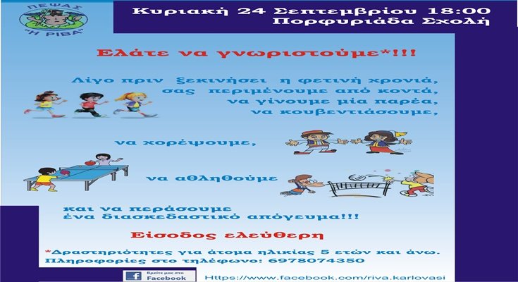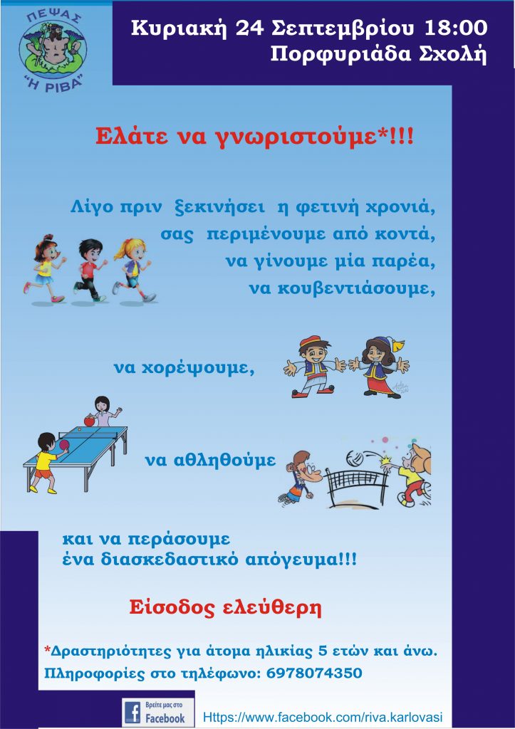Την Κυριακή 24 Σεπτεμβρίου στις 6 μ.μ. σας περιμένουν, μικρούς και μεγάλους στην Πορφυριάδα Σχολή να γίνετε μία παρέα, να χορέψετε, να παίξετε, και να αθληθείτε.