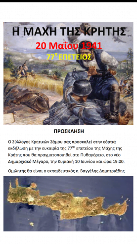 Ο Σύλλογος Κρητικών Σάμου σας προσκαλεί στην εόρτια εκδήλωση με την ευκαιρία της 77ης επετείου της Μάχης της Κρήτης που θα πραγματοποιηθεί στο Πυθαγόρειο, στο νέο Δημαρχιακό Μέγαρο, την Κυριακή 10 Ιουνίου και ώρα 19:00.