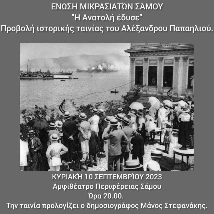 Εκδήλωση Μνήμης για την Μικρασιατική καταστροφής του 1922 διοργανώνει η Ένωση Μικρασιατών Σάμου την Κυριακή 10 Σεπτεμβρίου 2023 και ώρα 20.00 στο Αμφιθέατρο της Περιφέρειας Σάμου.