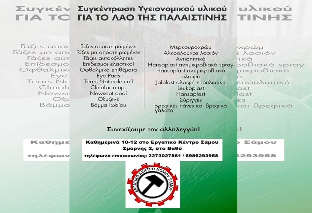 Στα πλαίσια των δράσεων αλληλεγγύης του Εργατικού Κέντρου Σάμου στον Παλαιστινιακό λαό, συγκεντρώνουμε υγειονομικό υλικό σε Σάμο και Ικαρία και αυστηρά τα παρακάτω είδη: