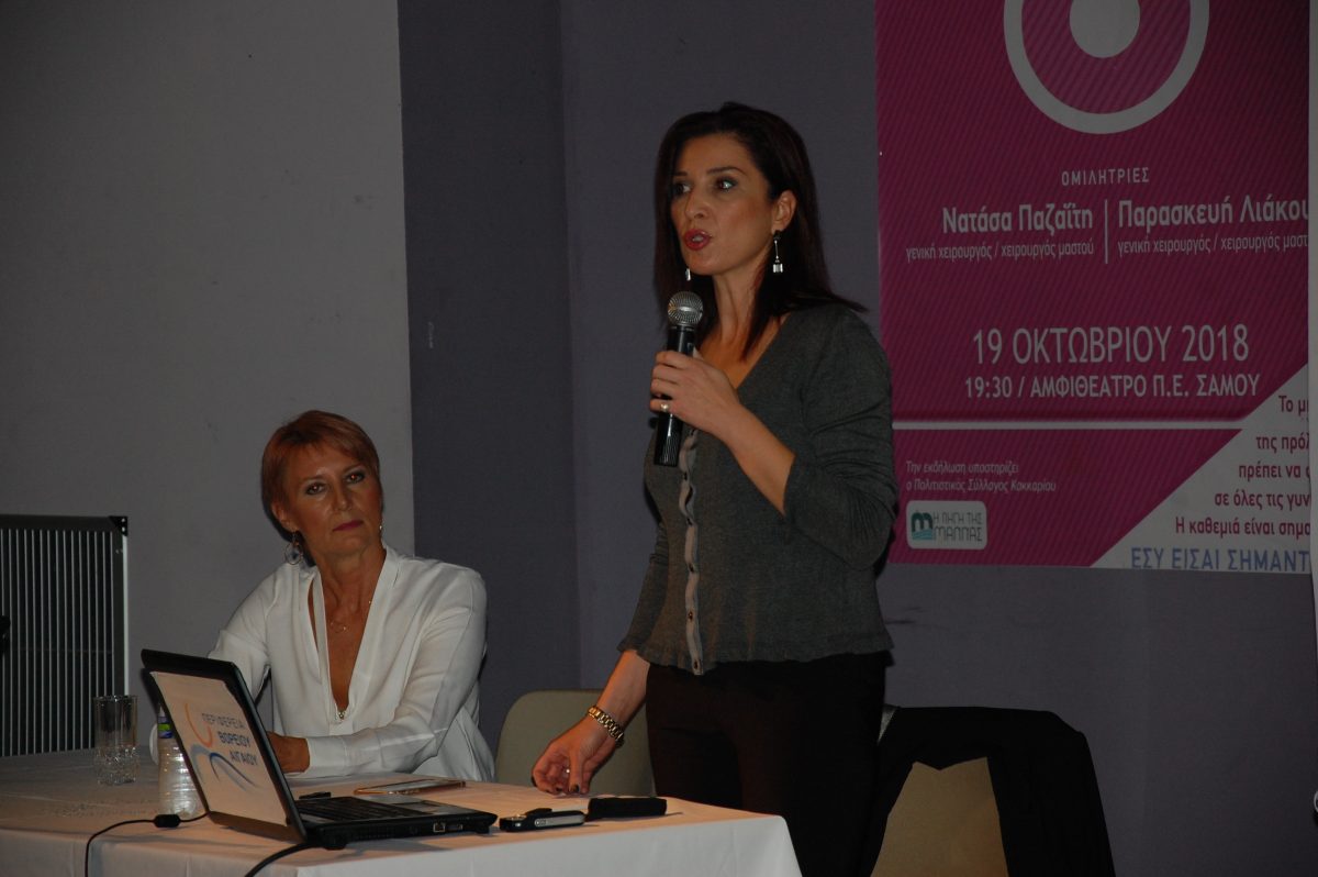 Στην κατάμεστη αίθουσα του αμφιθέατρου της Περιφερειακής Ενότητας Σάμου , ο Σύλλογος Κοκκαρίου «Η πηγή της Μάννας» διοργάνωσε το βράδυ της Παρασκευής 19 Οκτωβρίου την ενημερωτική εκδήλωση με θέμα: Καρκίνος του Μαστού. Η έγκαιρη διάγνωση σώζει ζωές, στο πλαίσιο της καθιέρωσης του Οκτωβρίου, ως μήνα Πρόληψης και Ενημέρωσης για τον Καρκίνο του Μαστού, με ομιλήτρια τη Γενική Χειρουργό-Ειδική Χειρουργό Μαστού, Νατάσα Παζαΐτη. Εκτός απο την Νατάσσα Παζαΐτη ομιλήτρια ήταν επίσης η ειδική μαστολογος Παρασκευή Λιάκου.
