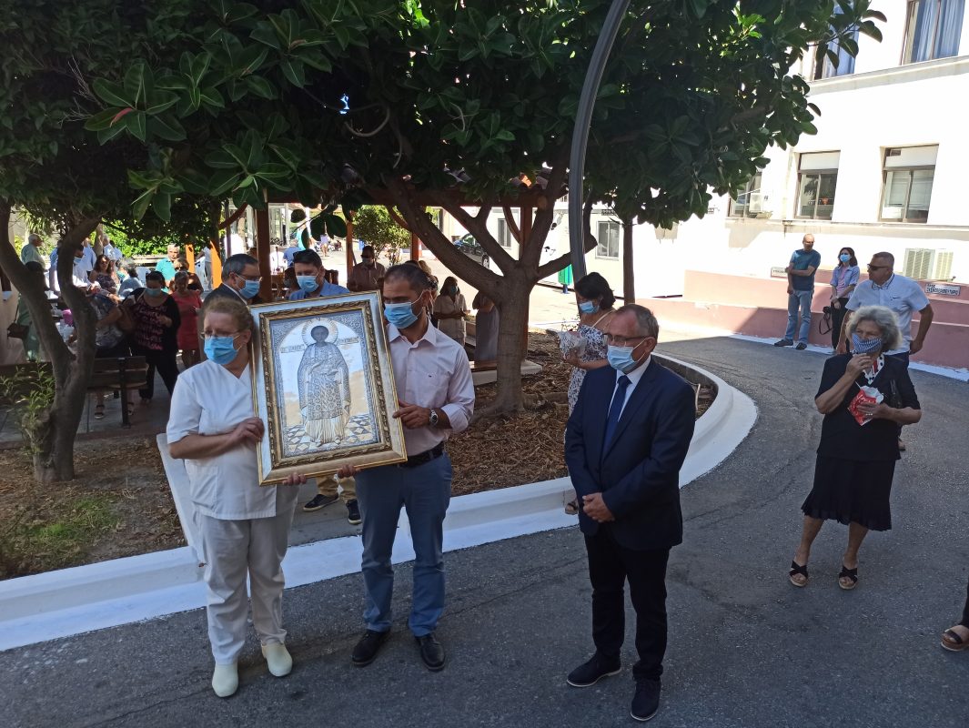 Στο τέλος της θείας Λειτουργίας έγινε η περιφορά της εικόνας του Αγίου στο προαύλιο χώρο του νοσοκομείου και στους θαλάμους των ασθενών.