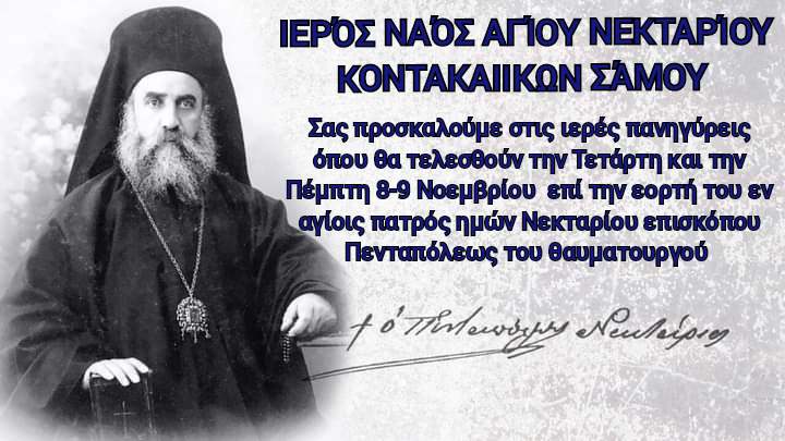 Αγαπητοί μου αδελφοί σας ανακοινώνουμε ότι την Τετάρτη 08/11/2023 και ώρα 18:30 τα τελεσθεί ο μέγας πανηγυρικός εσπερινός μετ’ αρτοκλασίας του εν αγίοις πατρός ημών Νεκταρίου επισκόπου Πενταπόλεως του θαυματουργού στόν ιερό ναό Αγίου Νεκταρίου Κοντακαιΐκων Σάμου.