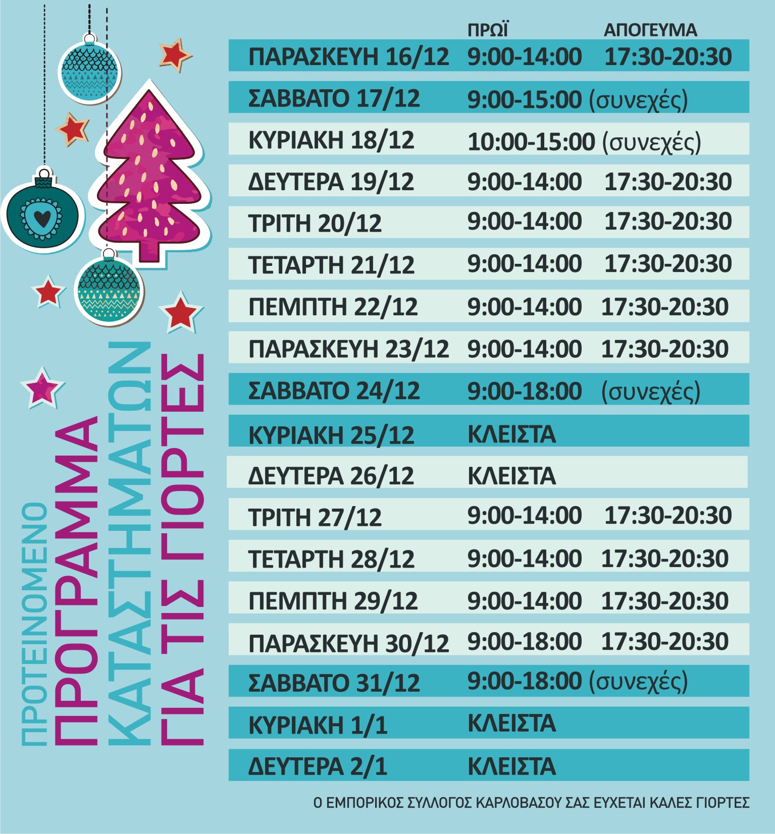 Εορταστικό ωράριο καταστημάτων από τον Εμπορικό Σύλλογο Καρλοβάσου.