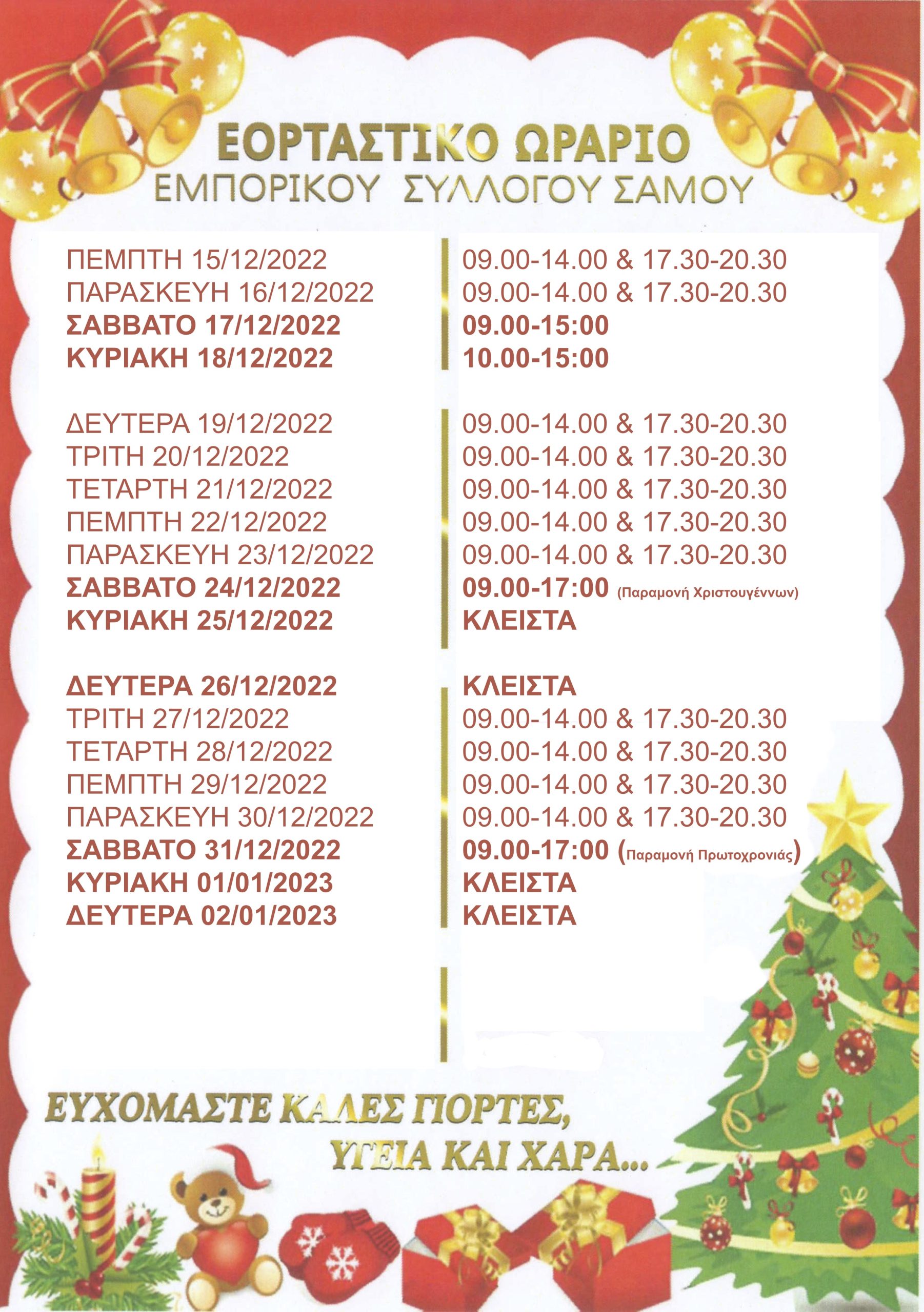 Το εορταστικό ωράριο των καταστημάτων για τα Χριστούγεννα και τη Πρωτοχρονιά ανακοίνωσαν οι Εμπορικοί Σύλλογοι της Σάμου