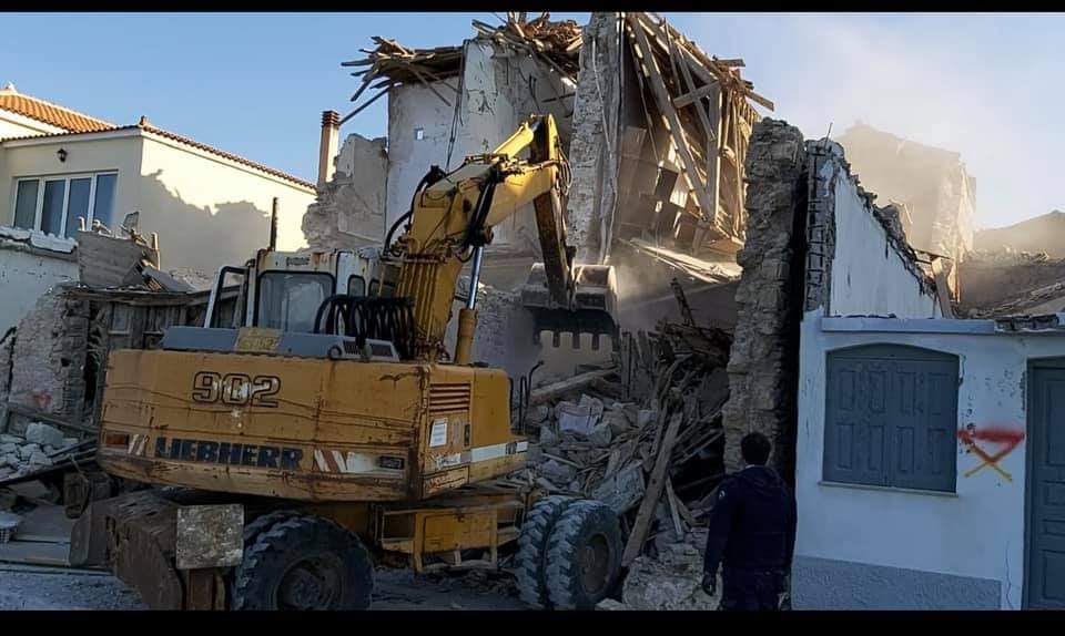 Μετά την οριστική συγκατάθεση της ιδιοκτήτριας τράπεζας ο Δήμος Δυτικής Σάμου επέτυχε σήμερα να απομακρύνει το ετοιμόρροπο κτίριο επί της παραλιακής Καρλοβάσου , οδό Βυρσοδεψείων.