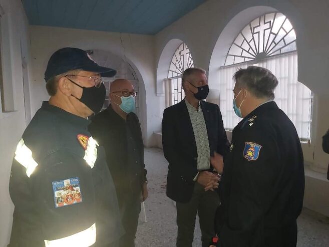 Ο Υφυπουργός επισκέφθηκε το χώρο των εθελοντικών κλιμακίων Σάμου & Βαθέος, την πληγείσα κοινότητα (Άνω) Βαθέος και την πληγείσα από το σεισμό περιοχή της πόλης της Σάμου.