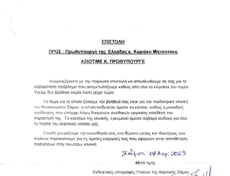 Για το τραγικό σημείο που έχει περιέλθει η κατάσταση με την έλλειψη παιδιάτρων στο Νοσοκομείο Σάμου γονείς, απέστειλαν επιστολή στον Κυριάκο Μητσοτάκη ζητώντας την παρέμβαση του για την επάνδρωση της Παιδιατρικής Κλινικής του Νοσοκομείου.