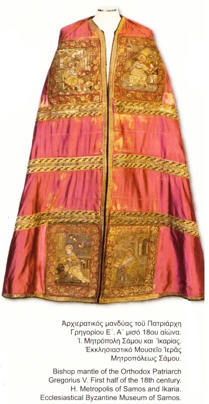 1ον ο Αρχιερατικός Μανδύας του Αγίου Εθνοιερομάρτυρος Γρηγορίου του Ε΄ Πατριάρχου Κωνσταντινουπόλεως (Εκκλησιαστικό Μουσείο Ιεράς Μητροπόλεως Σάμου και Ικαρίας). Διαστάσεις: 1,70 cm χ 0,80 cm