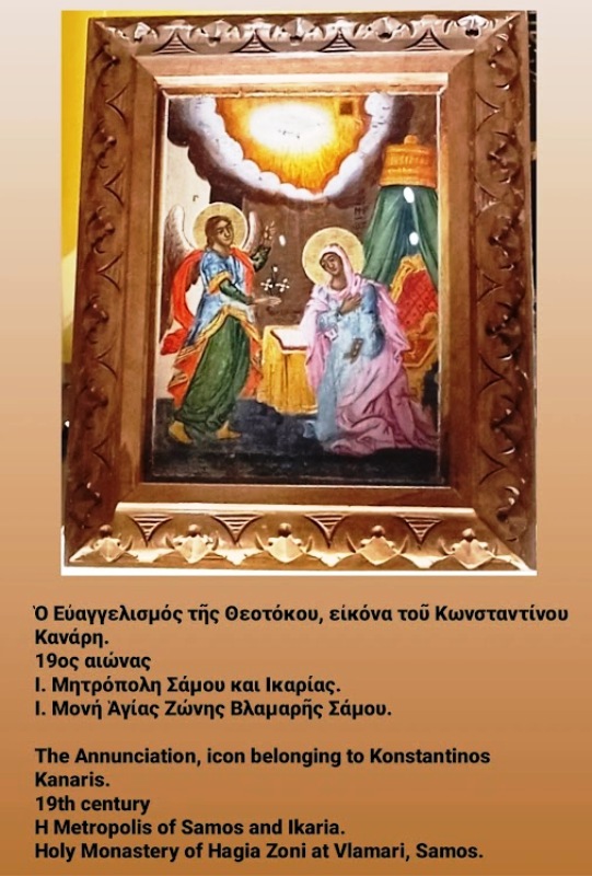 2ον η Ιερά Εικόνα Ευαγγελισμού της Θεοτόκου κειμήλιο του Ήρωος της Ελληνικής επαναστάσεως Κωνσταντίνου Κανάρη (Ιερά Μονή Αγίας Ζώνης Βλαμαρής Σάμου). Διαστάσεις: 0,30 cm χ 0,24 cm που είχαν επιλεγεί για την έκθεση της Εκκλησίας της Ελλάδος στο Βυζαντινό και Χριστιανικό Μουσείο στην Αθήνα από 8/2/2022 έως 30/5/2022 επεστράφησαν και παρελήφθησαν από την Ιερά Μητρόπολή μας.