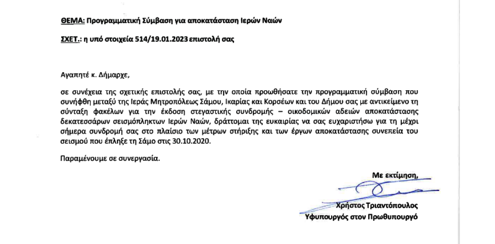 σε συνέχεια της σχετικής σας επιστολή με την οποία προωθήσατε την προγραμματική σύμβαση που συνήφθη μεταξύ της Ιεράς Μητροπόλεως Σάμου Ικαρίας& Κορσεών και του Δήμου σας  με αντικείμενο τις σύνταξη  φακέλων για την έκδοση στεγαστικής συνδρομής – οικοδομικών αδειών  αποκατάστασης δεκατεσσάρων σεισμόπληκτων Ιερών Ναών, δράττομαι την ευκαιρία να σας ευχαριστήσω για τη μέχρι σήμερα συνδρομή σας στο πλαίσιο των μέτρων στήριξης και των έργων αποκατάστασης συνέπεια του σεισμού που έπληξε τη Σάμο στις 30.10.2020.