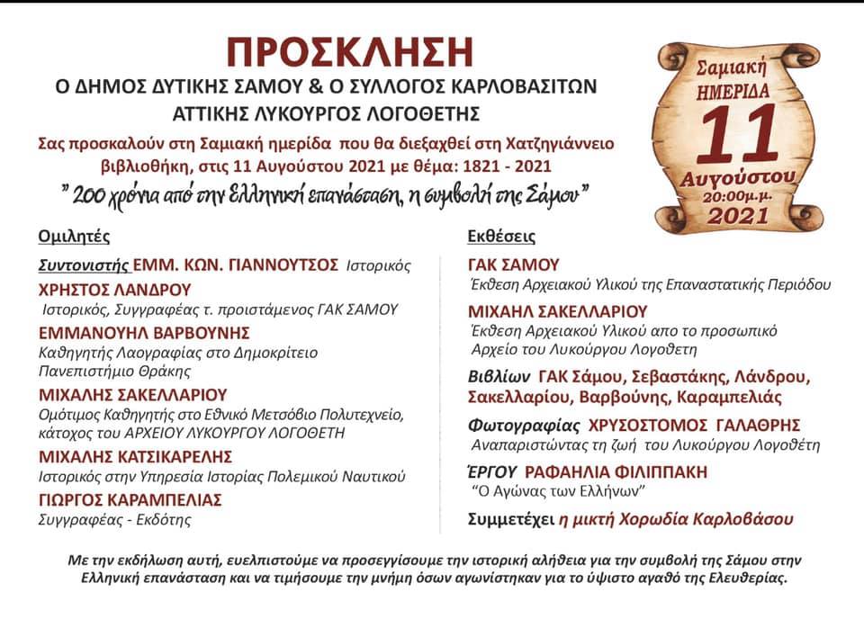 Ο Δήμος Δυτικής Σάμου και ο Σύλλογος Καρλοβασιτών Αττικής «Λυκούργος Λογοθέτης», με την υποστήριξη των ΓΑΚ Σάμου, διοργανώνει ημερίδα την Τετάρτη, 11 Αυγούστου, στη Χατζηγιάννειο Βιβλιοθήκη (αύλειος χώρος), στο Καρλόβασι, στις 8 μ.μ.