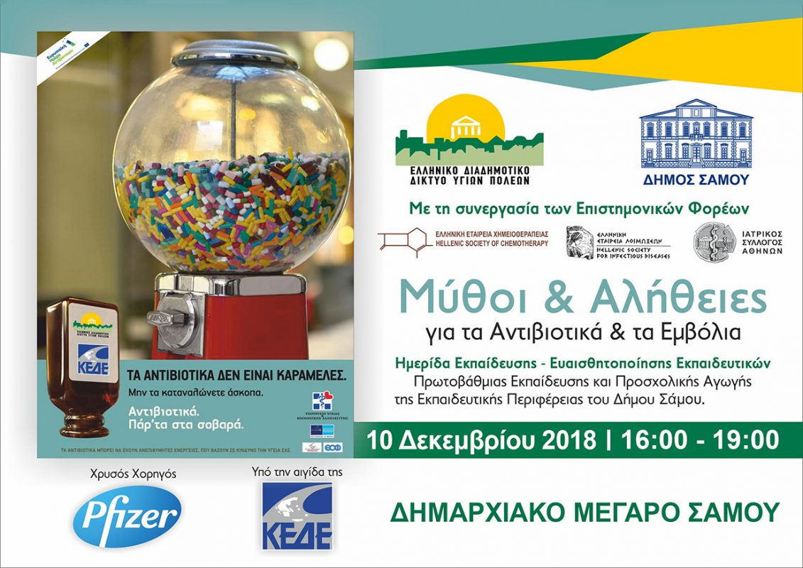 Ο Δήμος Σάμου, μέλος του Ελληνικού Διαδημοτικού Δικτύου Υγιών Πόλεων του Παγκόσμιου Οργανισμού Υγείας (Π.Ο.Υ) και το Ελληνικό Διαδημοτικό Δίκτυο Υγιών Πόλεων, διοργανώνουν, στο πλαίσιο της Πανελλήνιας Εκστρατείας ευαισθητοποίησης και ενημέρωσης του πληθυσμού για την ορθή χρήση των αντιβιοτικών και των εμβολίων, Ημερίδα εκπαίδευσης και ευαισθητοποίησης των Εκπαιδευτικών Προσχολικής Αγωγής και Πρωτοβάθμιας Εκπαίδευσης.