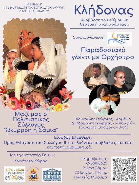 Ο Εξωραϊστικός Πολιτιστικός Σύλλογος “Η Ειρήνη” σε συνεργασία με την Περιφέρεια Βορείου Αιγαίου διοργανώνουν την αναβίωση του παραδοσιακού εθίμου του Κλήδονα. Η εκδήλωση θα πραγματοποιηθεί στις 23 Ιουνίου, στις 7:30 μ.μ., στην πλατεία της Χώρας Σάμου.