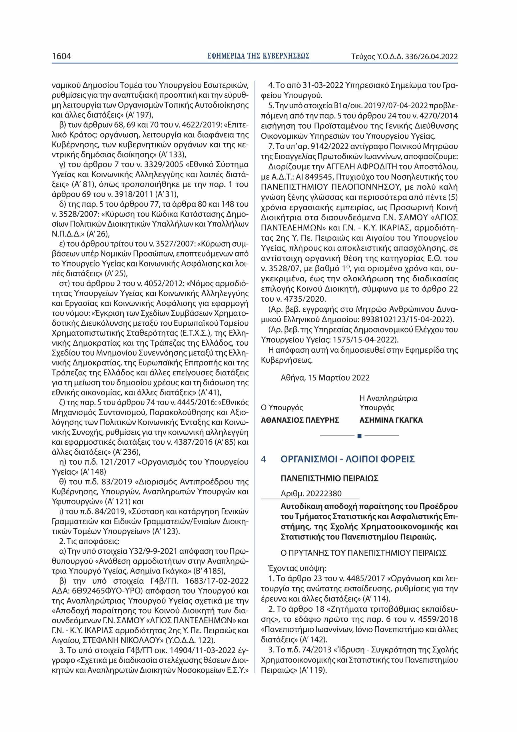Διορίζουμε την κ. ΑΓΓΕΛΗ ΑΦΡΟΔΙΤΗ του Αποστόλου, με Α.Δ.Τ.: ΑΙ 849545, Πτυχιούχο του