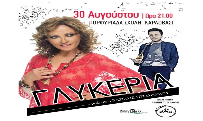 Ο Αθλητικός Σύλλογος «Κέρκης Μαραθοκάμπου» Σάμου και η εταιρεία «Όψεις Πολιτισμού», υποδέχονται τη Γλυκερία, στην Πορφυριάδα Σχολή, στο Καρλόβασι, την Πέμπτη 30 Αυγούστου και ώρα 21.00.