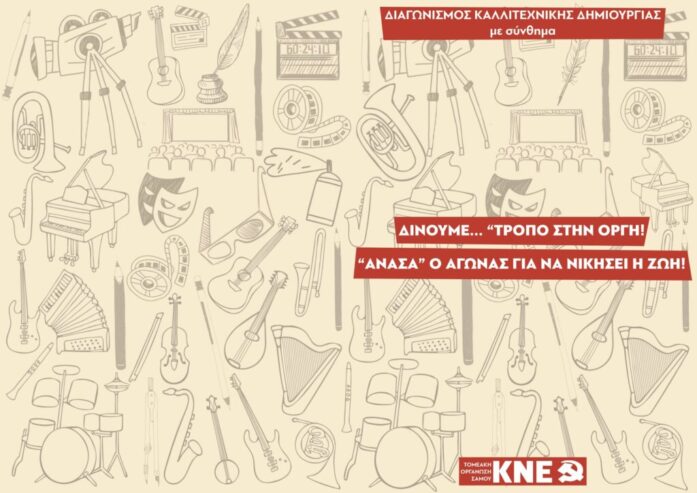 Η Τομεακή Οργάνωση Σάμου της ΚΝΕ καλεί όλους τους νέους και τις νέες του νησιού μας να λάβουν μέρος στον διαγωνισμό καλλιτεχνικής δημιουργίας που προκηρύσσει με σύνθημα «Δίνουμε… “τρόπο” στην οργή! “Ανάσα” ο αγώνας για να νικήσει η ζωή!».