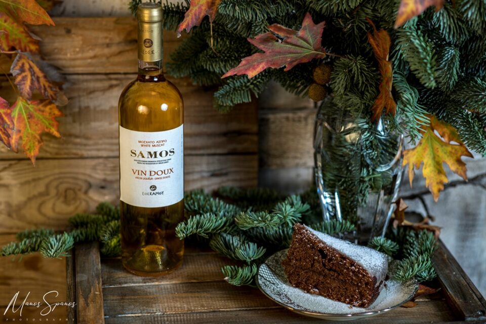Η βασιλόπιτα αυτή, εκτός από το «χρυσό φλουρί» περιλαμβάνει και το «υγρό χρυσάφι» της ακριτικής Σάμου, το ονομαστό και πολυβραβευμένο διεθνώς SAMOS VIN DOUX του Ενιαίου Οινοποιητικού Αγροτικού Συνεταιρισμού του νησιού.Ως ένα κλασσικό επιδόρπιο κρασί, σερβίρεται μετά το φαγητό στους 8-10 βαθμούς C. Το πλούσιο σώμα του μπορεί να αποτελέσει ένα καταπληκτικό υλικό για γλυκές δημιουργίες, ενώ συνοδεύει μοναδικά όλα τα επιδόρπια, καθώς και ελαφρά γλυκά όπως η βασιλόπιτα, η μηλόπιτα, η λεμονόπιτα, τάρτες φρούτων αλλά και τα έντονα κρεμώδη. Σερβίρεται όμως και πριν το φαγητό ως απεριτίφ ή μετά το δείπνο με φρούτα, τυριά, ξηρούς καρπούς.