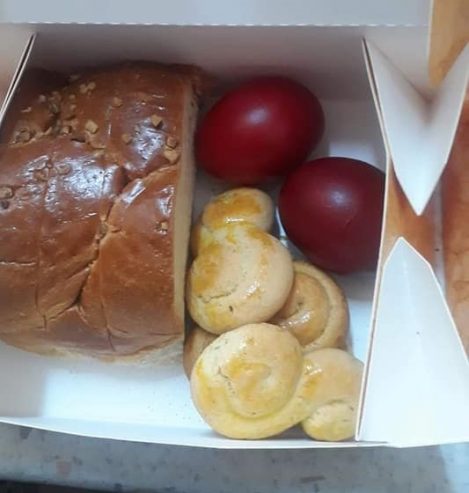 Εκτός από το γεμιστό κατσίκι προσφέρθηκαν κόκκινα αυγά, κουλουράκια, τσουρέκι για να είναι γεμάτο και γιορτινό το τραπέζι όλων μας..
