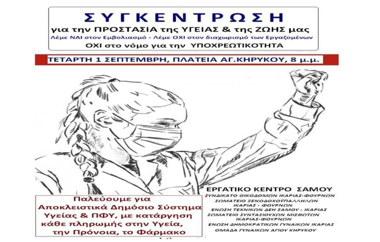 Καλούμε τους εργαζόμενους, τους άνεργους, τους συνταξιούχους ,τις γυναίκες,τη νεολαία, σε στήριξη των κινητοποιήσεων των υγειονομικών και σε συμμετοχή στην συγκέντρωση του Εργατικού Κέντρου Σάμου την Τετάρτη 1η Σεπτεμβρίου, ώρα 8 μ.μ. στην πλατεία Αγίου Κηρύκου.