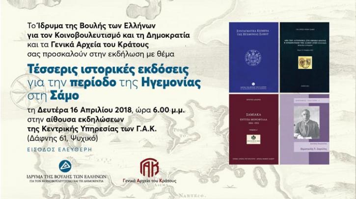 Το Ίδρυμα της Βουλής των Ελλήνων για τον Κοινοβουλευτισμό και τη Δημοκρατία και τα Γενικά Αρχεία του Κράτους διοργανώνουν εκδήλωση με θέμα «Τέσσερις ιστορικές εκδόσεις για την περίοδο της Ηγεμονίας στη Σάμο», και μέσα από τις σελίδες τεσσάρων τόμων τους, παρουσιάζουν ολοκληρωμένα την περίοδο της Ηγεμονίας, της Επανάστασης του 1912 και των πρώτων ετών μετά την Ενσωμάτωση της Σάμου στην Ελλάδα. Η εκδήλωση θα πραγματοποιηθεί τη Δευτέρα 16 Απριλίου και ώρα 6.00 μ.μ. στην αίθουσα εκδηλώσεων της Κεντρικής Υπηρεσίας των Γενικών Αρχείων του Κράτους (Δάφνης 61, Ψυχικό) και η είσοδος για το κοινό είναι ελεύθερη.