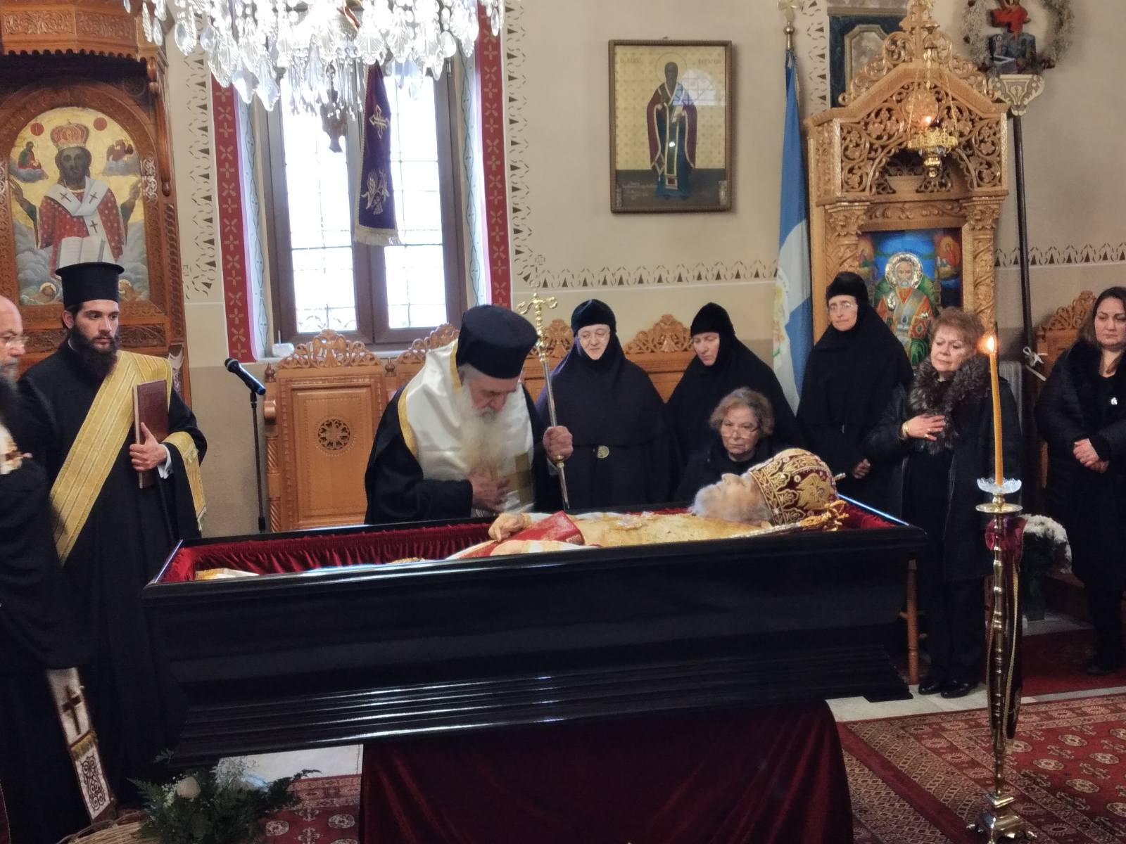 Περί τήν 12ην μεσημβρινήν ἐν Ἐκκλησίᾳ πληθούσῃ ἐτελέσθη ἡ ἐξόδιος ἱερά Ἀκολουθία ὑπέρ αἰωνίας μνήμης καί μακαρίας ἀναπαύσεως τῆς ψυχῆς τοῦ πρός Κύριον μεταστάντος Πατριάρχου κυροῦ Εἰρηναίου, προεξάρχοντος τοῦ Σεβασμιωτάτου Μητροπολίτου Ναζαρέτ κ.κ. Κυριακοῦ, ἐκπροσώπου τῆς Σιωνίτιδος Ἐκκλησίας καί συγχοροστατούντων τοῦ Σεβασμιωτάτου Μητροπολίτου Γουϊνέας κ.κ. Γεωργίου, ἐκπροσώπου τῆς Ἀλεξανδρινῆς Ἐκκλησίας καί τοῦ Σεβασμιωτάτου Ποιμενάρχου μας κ.κ. Εὐσεβίου, ἐκπροσώπου τῆς Α.Μ. τοῦ Ἀρχιεπισκόπου Ἀθηνῶν κάι πάσης Ἑλλάδος κ.κ. Ἱερωνύμου καί τῆς Ἱερᾶς Συνόδου τῆς Ἐκκλησίας τῆς Ἑλλάδος, τῇ συμμετοχῇ τῶν ἐξ Ἱεροσολύμων καί ἐξ Ἀθηνῶν προσελθόντων Κληρικῶν, ἐν οἷς ὁ ἐν Ἀθήναις Ἔξαρχος τοῦ Παναγίου Τάφου Ἀρχιμ. π. Ραφαήλ καί ὁ Γεν. Διευθυντής τῆς ΕΚΥΟ Ἀρχιμ. Νικόδημος Φαρμάκης, ὡς καί πλειάδος Σαμίων Ἱερέων καί Διακόνων, πλαισιούμενοι ὑπό Χοροῦ Σαμίων Ἱερέων καί Ἱεροψαλτῶν.