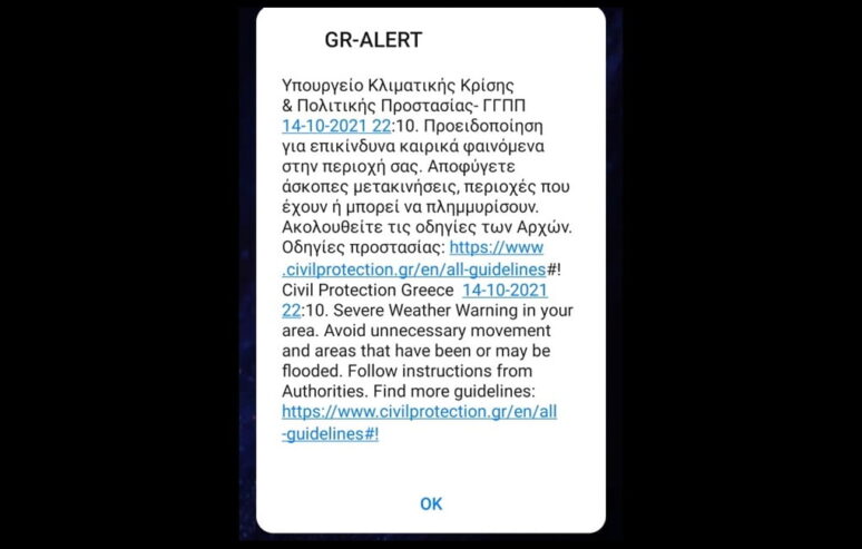 Όπως αναφέρει το μήνυμα απο το Υπουργείο Κλιματικής Κρίσης και Πολιτικής Προστασίας: Προειδοποίηση για επικίνδυνα καιρικά φαινόμενα στην περιοχή σας. Αποφύγετε άσκοπες μετακινήσεις, περιοχές που έχουν ή μπορεί να πλημμυρίσουν.