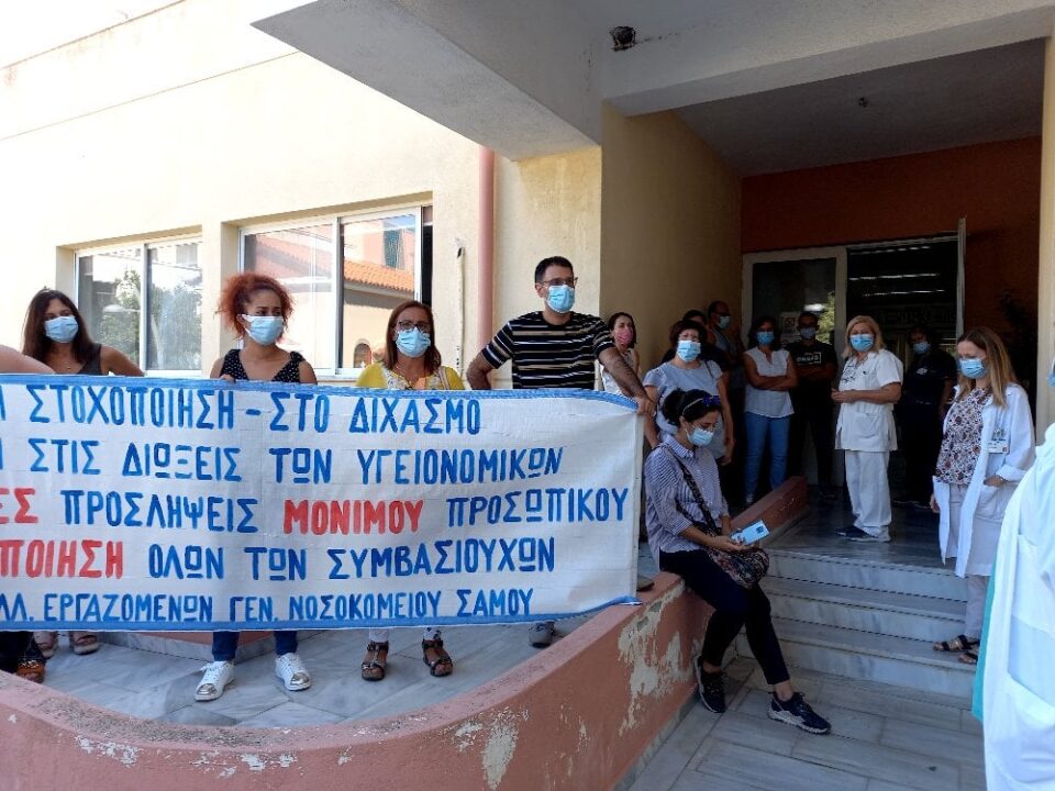 Το Δ.Σ. του συλλόγου εργαζομένων του Γενικού Νοσοκομείο Σάμου πραγματοποίησε και σήμερα Πέμπτη 02/9/2021 ώρα 7:00- 10:00 πμ κινητοποίηση – κατάληψη στις διοικητικές υπηρεσίες του νοσοκομείου για δεύτερη συνεχόμενη μέρα με μεγάλη συμμέτοχη των συναδέλφων εμβολιασμένων και ανεμβολίαστων ενάντια στις διώξεις και απολύσεις που έχει εξαγγείλει η κυβέρνηση για τους υγειονομικούς.