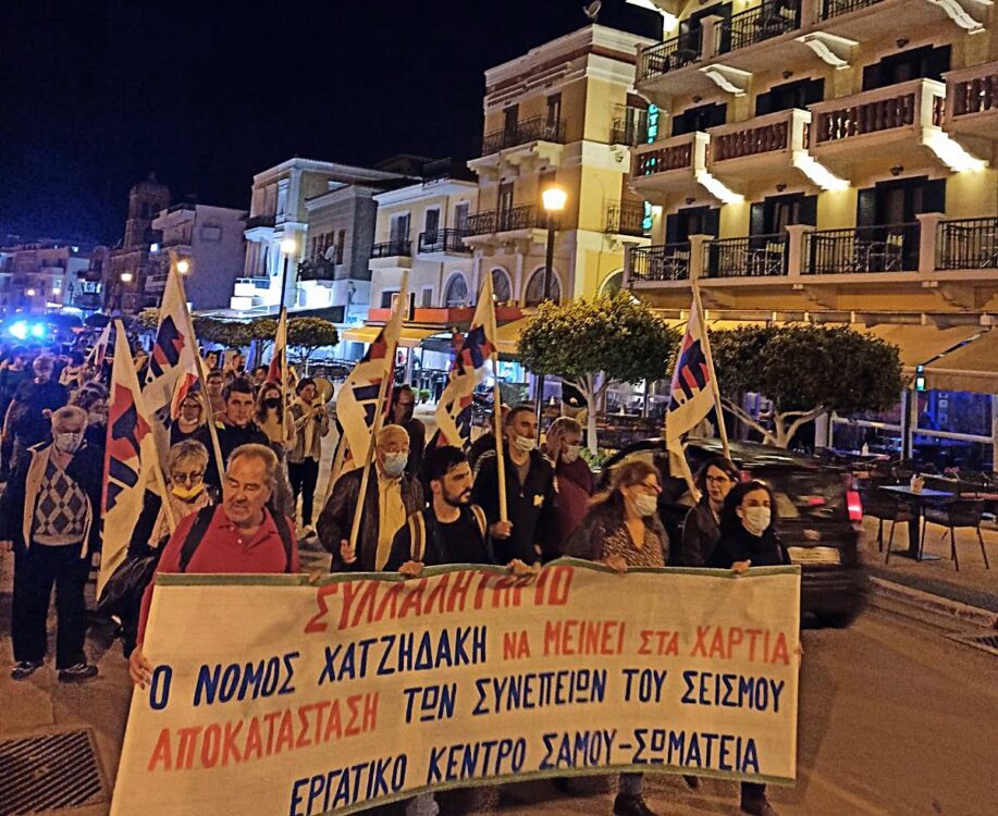 Πραγματοποιήθηκε χθες 4-11 η κινητοποίηση του Εργατικού Κέντρου Σάμου, του ΝΤ της ΑΔΕΔΥ, σωματείων και φορέων στο Βαθύ της Σάμου με σκοπό να διατρανωθεί για άλλη μια φορά η ριζική αντίθεση στον αντεργατικό νόμο Χατζηδάκη και το πώς θα οργανωθεί καλύτερα η δράση ώστε να μείνει στα χαρτιά και να μην εφαρμοστεί. Παράλληλα, εκφράστηκε κραυγή αγωνίας γιατί έχει περάσει ένας χρόνος από το φονικό σεισμό της 30ης Οκτωβρίου και η τοπική κοινωνία συνεχίζει να ζει με τις καταστροφικές συνέπειές του και την ανασφάλεια. Τα ψεύτικα μεγάλα λόγια και οι υποσχέσεις περισσεύουν αλλά αυτά δεν μπορούν να κρύψουν την πραγματικότητα. Το κράτος και οι υπηρεσίες του να κινούνται με ρυθμούς χελώνας και ο κόσμος να μένει σε κίτρινα κτίρια με ευθύνη του για την ίδια του τη ζωή και με γκρεμισμένα ή ετοιμόρροπα κτίρια γύρω του.