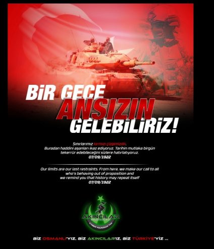 Η εικόνα συνοδεύει η φράση «Μία νύχτα μπορούμε να έρθουμε», γραμμένη στην τουρκική γλώσσα, με απειλές για μία νέα καταστροφή.