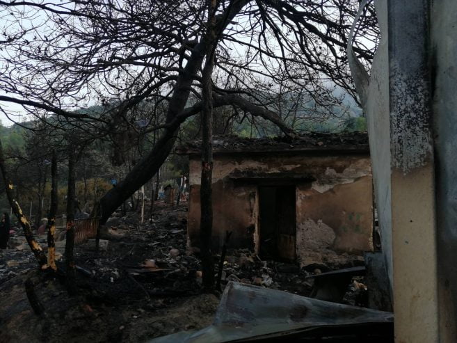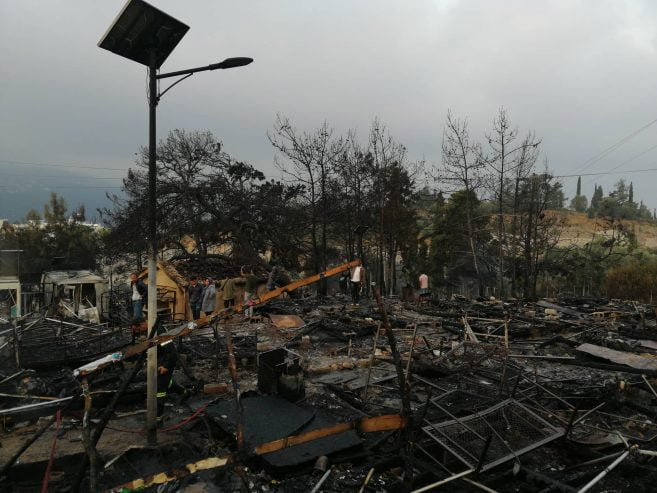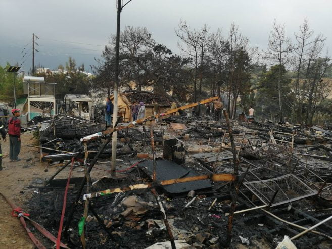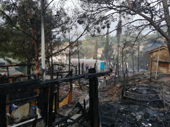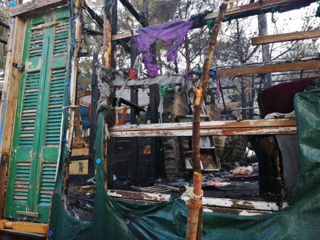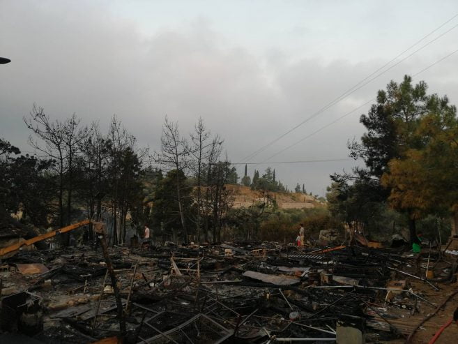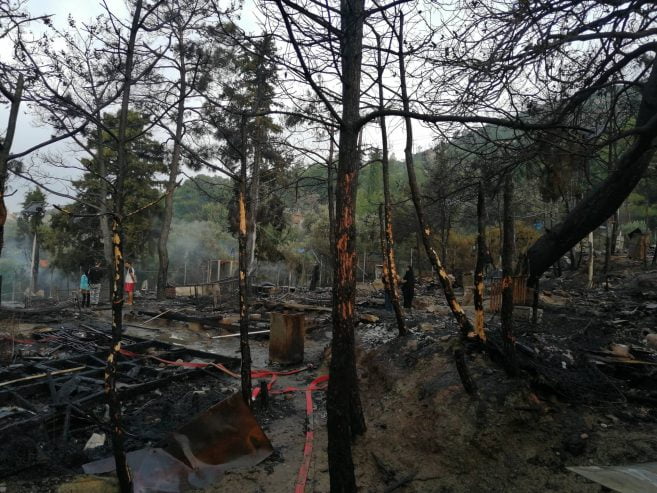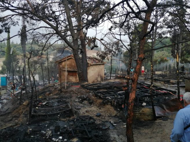 Από την πυρκαγιά καταστράφηκαν: δεκαπέντε (15) σκηνές τύπου Λουξεμβούργου των 15 ατόμων έκαστη, εννέα (9) σκηνές τύπου life shelter ολοσχερώς και δύο (2) μερικώς, ένας (1) οικίσκος WC και ένας (1) οικίσκος μερικώς, δύο (2) μικρά κτίσματα- αποθήκες (ισόγειες πέτρινες με κεραμοσκεπή) με τα υλικά που υπήρχαν εντός αυτών καθώς και όλα τα είδη ρουχισμού και είδη κλινοστρωμνής που υπήρχαν εντός των σκηνών. Επίσης κάηκαν πεύκα και ελιές, έκτασης ενός (1) στρέμματος. Επισημαίνεται ότι στα ανωτέρω καιόμενα καταλύματα υπήρχε ανεξακρίβωτος αριθμός φιαλών υγραερίου (γκαζάκια) και φιάλες των πέντε (5) και δέκα (10) kgr οι οποίες πολλές από αυτές απομακρύνθηκαν από τις φλεγόμενες εστίες.
