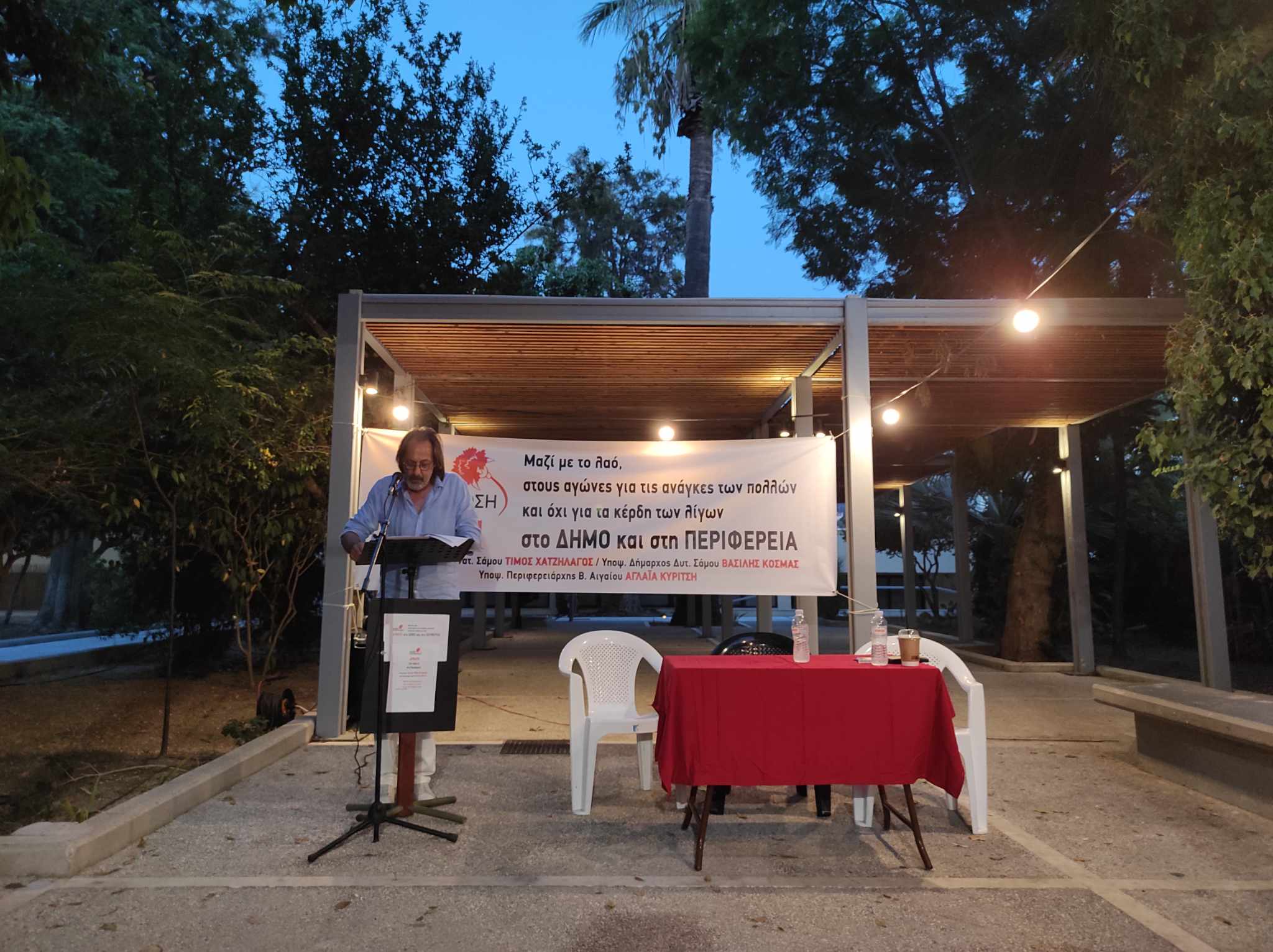 Ανοίγοντας την εκδήλωση ο Γραμματέας της Τ.Ε Σάμου του ΚΚΕ Σταμάτης Φιλιππής κάλεσε τα μέλη, τους φίλους και τους συνεργαζόμενους με το ΚΚΕ, να δώσουν με αποφασιστικότητα τη μάχη των δημοτικών και περιφερειακών εκλογών και να κάνουν το επόμενο μεγάλο βήμα για την ενίσχυσή του με την υπερψήφιση των ψηφοδελτίων της Λαϊκής Συσπείρωσης.