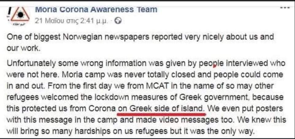 Η Οργάνωση MORIA CORONA AWARENESS TEAM σε δημοσίευσή της με ημερομηνία 21.05.2020 αναφέρεται στο «…Ελληνικό τμήμα της νήσου (Λέσβου)…» ( “…Greek side of island…”), αναφερόμενη στο τμήμα της Λέσβου πλην του Κ.Υ.Τ Μόριας, υπονοώντας ότι το έδαφος της δομής δεν αποτελεί Ελληνική επικράτεια.