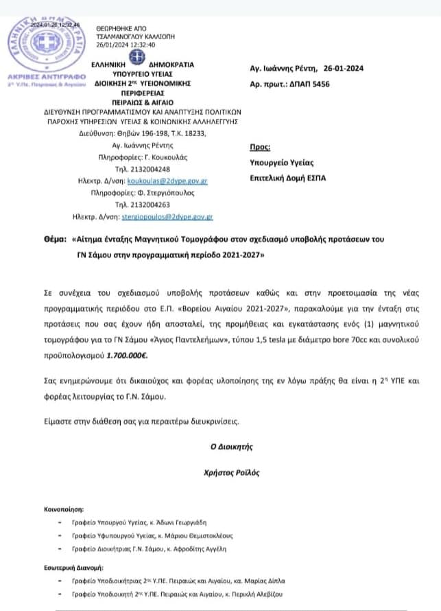 Ένας σύγχρονος μαγνητικός τομογράφος τύπου 1.5 Tesla, για τις ανάγκες του Νοσοκομείου Σάμου, συνολικού προϋπολογισμού , 1.700.000 ευρώ, θα αγοραστεί σύντομα μέσα από το ΕΣΠΑ, αναβαθμίζοντας σημαντικά τη δημόσια υγεία στην Σάμο.