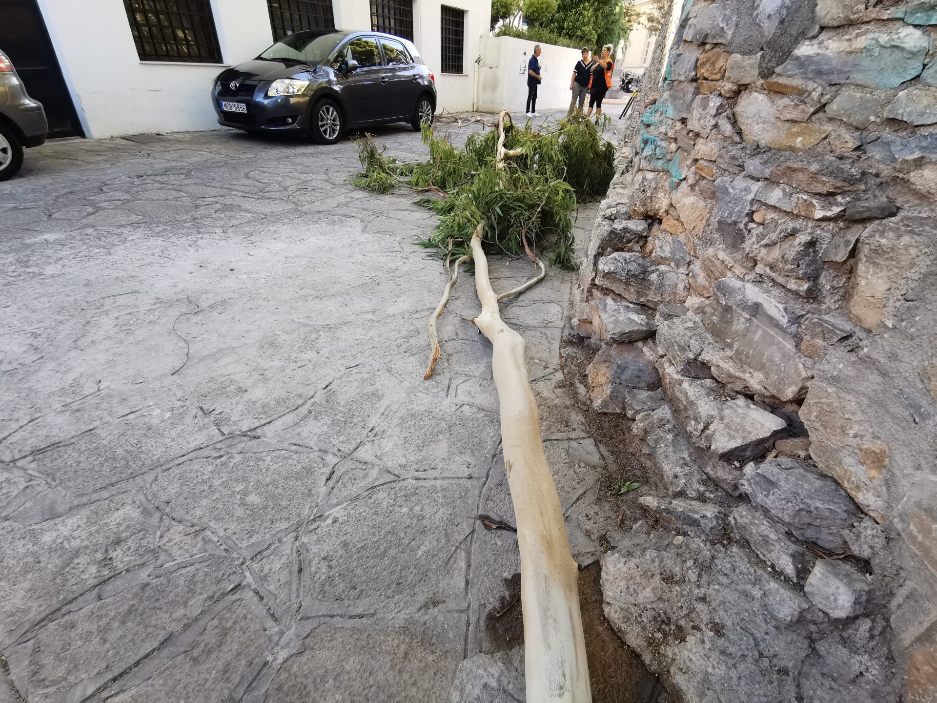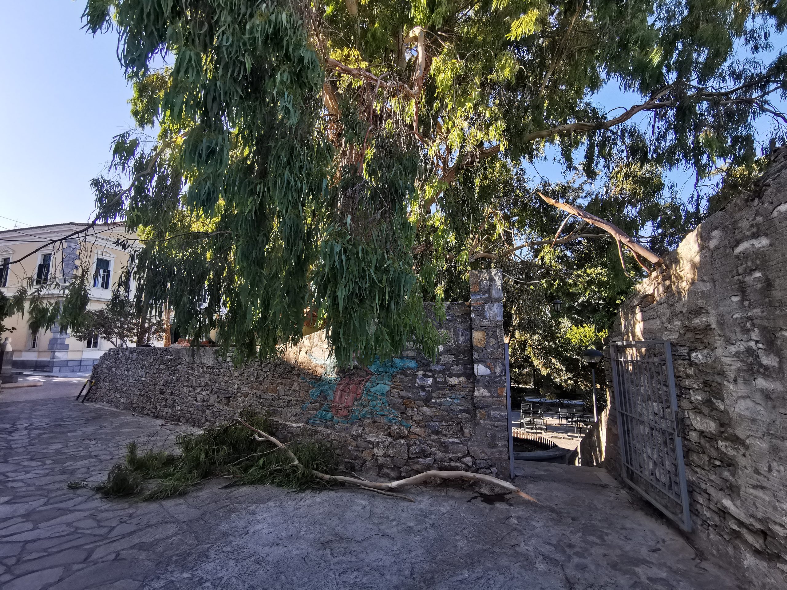 Ένα μεγάλο κλαδί  από δέντρο, έσπασε περίπου στις 6 το πρωί της Τρίτης στο στενό μεταξύ δημοτικού κήπου και αρχαιολογικού μουσείου και έπεσε πάνω σε αυτοκίνητο ευτυχώς χωρίς να τραυματιστεί κανείς.