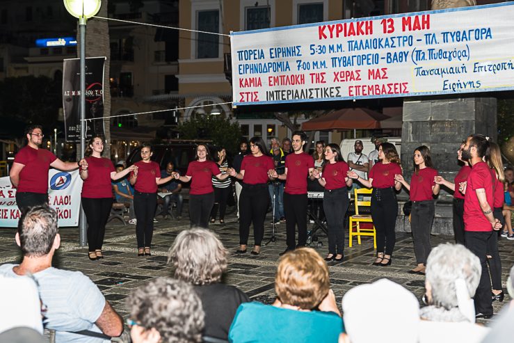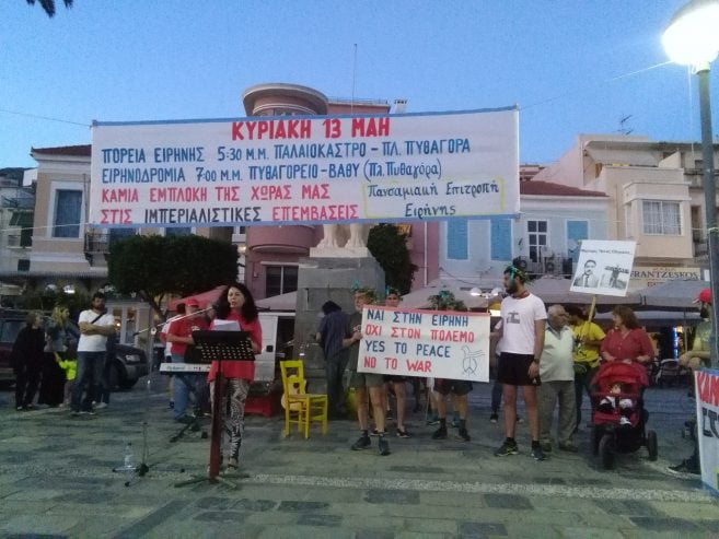 Στη Πλατεία Πυθαγόρα οι διαδηλωτές έφτασαν διασχίζοντας με συνθήματα μέρος της πόλης και ενώθηκαν με τους συγκεντρωμένους εκεί και λίγα λεπτά αργότερα με τους αθλητές που έτρεξαν τη διαδρομή από το Πυθαγόρειο στο Βαθύ, μεταφέροντας το μήνυμα «ΟΧΙ ΣΤΟΝ ΠΟΛΕΜΟ ΝΑΙ ΣΤΗΝ ΕΙΡΗΝΗ».