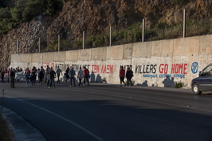Σε όλη τη διαδρομή τα συνθήματα της Ε.Ε.Δ.Υ.Ε έδιναν μαχητικό παλμό στη πορεία η οποία πέρασε από το Κέντρο Κράτησης Προσφύγων και μεταναστών και έφτασε στη πύλη του κέντρου παρά την αρχική απαγόρευση των ΜΑΤ που εμπόδιζαν την προσπέλαση. Εκεί διαβάστηκε από την Μαρία Βουλαρίνου μήνυμα στα αγγλικά της Επιτροπής Ειρήνης στο οποίο εκφράζονταν η αλληλεγγύη στα θύματα των ιμπεριαλιστικών πολέμων και η διεκδίκηση για άμεσο απεγκλωβισμό από τα νησιά και τη χώρα για να φτάσουν στον προορισμό τους.