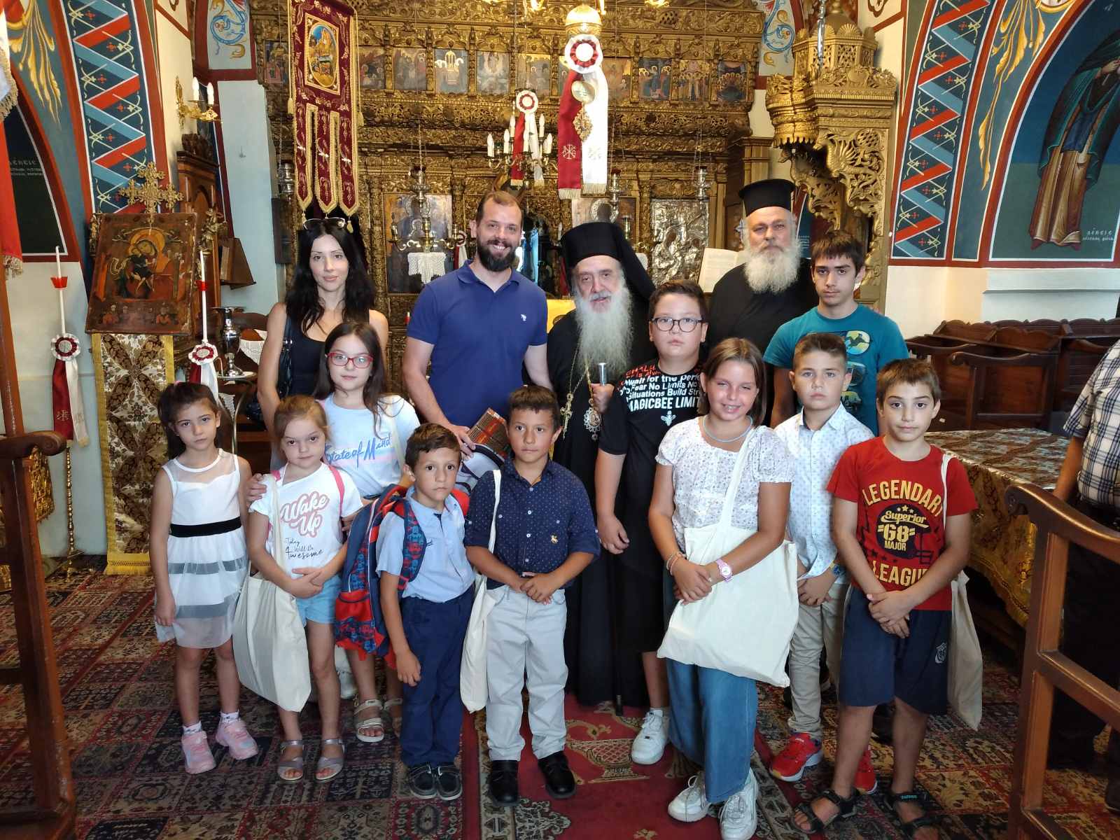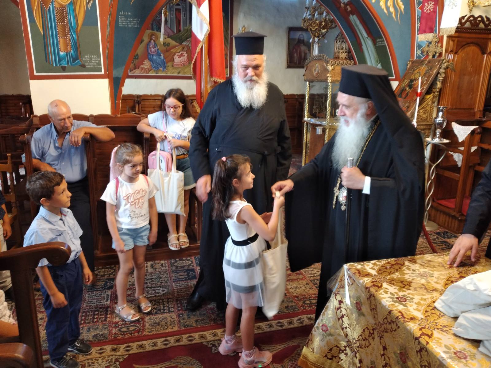Στη συνέχεια ο Σεβασμιώτατος μετέβη στο γειτονικό χωριό Βουρλιώτες όπου με την ευκαιρία της έναρξης του νέου Σχολικού έτους, συνάντησε τους 8 μαθητές και μαθήτριες του Δημοτικού Σχολείου Βουρλιωτών και τους 2 μαθητές του Νηπιαγωγείου. Ομίλησε πατρικά στα παιδιά και τους προσέφερε, σχολικές τσάντες και σχολικά είδη, παρουσία των Διδασκάλων και των Γονέων τους.