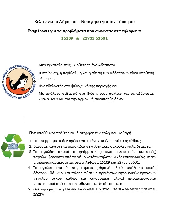 Ανταποκρινόμενοι στα αιτήματα των μαθητών Γυμνασίων και Λυκείων του Δήμου Ανατολικής Σάμου, με αφορμή τη δράση που πραγματοποιήθηκε στην αίθουσα του Δημοτικού Συμβουλίου στο πλαίσιο του Μνημονίου Συνεργασίας με τη UNICEF για το πρόγραμμα “ΠΟΛΕΙΣ ΦΙΛΙΚΕΣ ΠΡΟΣ ΤΑ ΠΑΙΔΙΑ”, ανακοινώνεται ότι από εδώ και στο εξής στο πίσω μέρος των λογαριασμών ΔΕΚΟ θα αποτυπώνονται κοινωνικά μηνύματα σχετικά με τα αδέσποτα ζώα και το περιβάλλον.