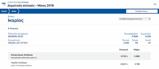 Διατηρώντας υψηλό ποσοστό, από την πρώτη Κυριακή, ο συνδυασμός «Πανικαριακή Ενότητα Αλλαγής» με επικεφαλής τον εκπαιδευτικό Νίκο Καλαμπόγια, επικράτησε του αντιπάλου του Νίκου Λαρδά με ποσοστό 57,18%. Παρακάτω ο πίνακας του υπουργείου Εσωτερικών με το αποτέλεσμα στον δήμο Ικαρίας και ενσωμάτωση 100% (27 εκλογικά τμήματα).