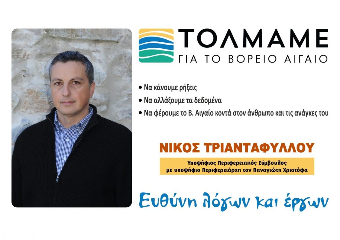 Νίκος Τριανταφύλλου (υποψήφιος περιφερειακός σύμβουλος με το συνδυασμό “ΤΟΛΜΑΜΕ για το Βόρειο Αιγαίο” με επικεφαλής τον Παναγιώτη Χριστόφα) Περιφέρεια Β. Αιγαίου με τόλμη και αξιοπιστία!